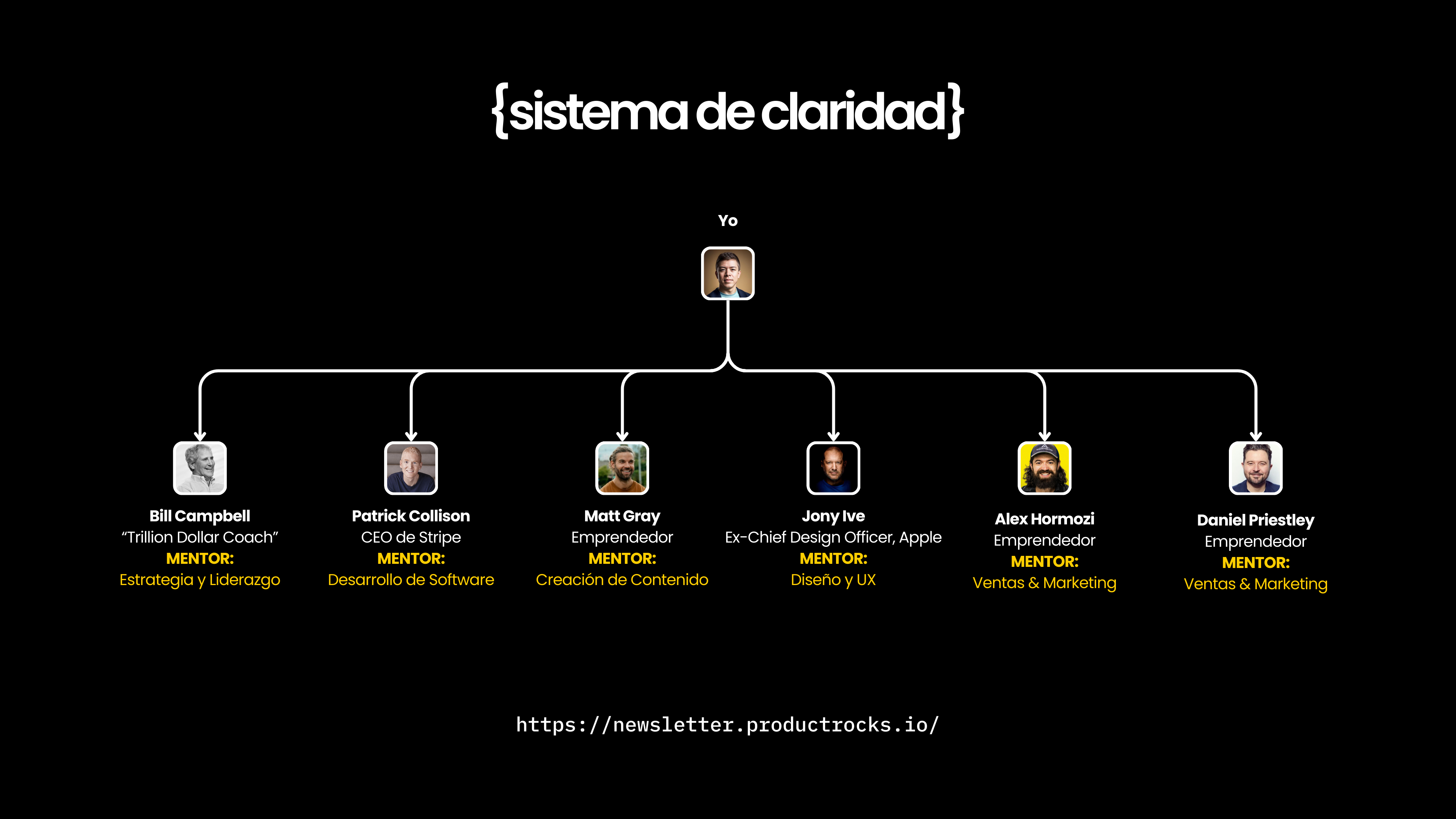 Hoy, mi sistema de claridad funciona exactamente así. En el centro estoy yo, y a mi alrededor he construido un consejo de mentores personalizados usando IA (específicamente, GPTs diseñados en ChatGPT), cada uno especializado en un área clave para apoyarme en el día a día.